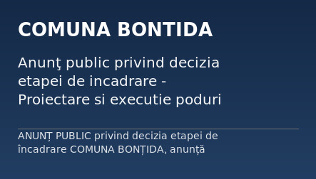 ANUNȚ PUBLIC privind decizia etapei de încadrare COMUNA BONȚIDA, anunță publicul...
