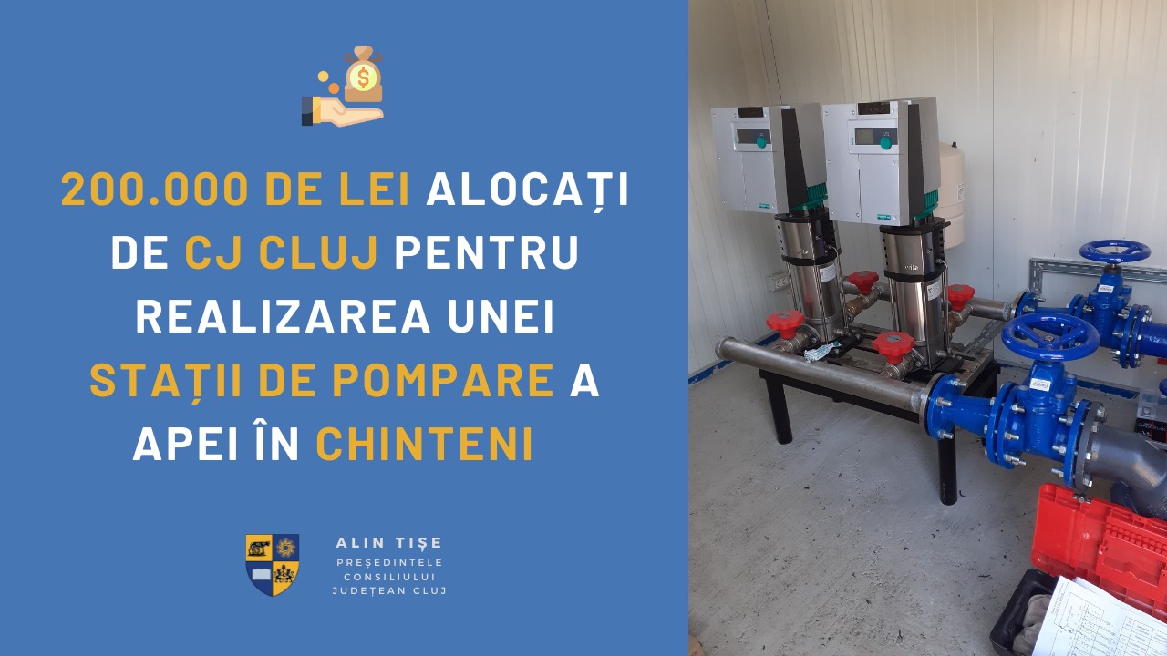 „În ședința extraordinară din data de 14.11.2025, Consiliul Județean Cluj a alocat, Comunei Chinteni suma de 200.000 lei din fondul de rezervă al bugetului local al Județului Cluj, în vederea realizării stației de pompare aferentă extinderii rețelei de alimentare cu apă la obiectivul de investiții „Baza Sportivă Chinteni”.Mulțumim domnului Președinte al Consiliului Județean Cluj, Alin Tișe și tuturor consilierilor județeni care au înțeles necesitatea și importanța unui astfel de obiectiv pentru comunitatea noastră locală”, a declarat doamna primar Magdalena Lucia Suciu.