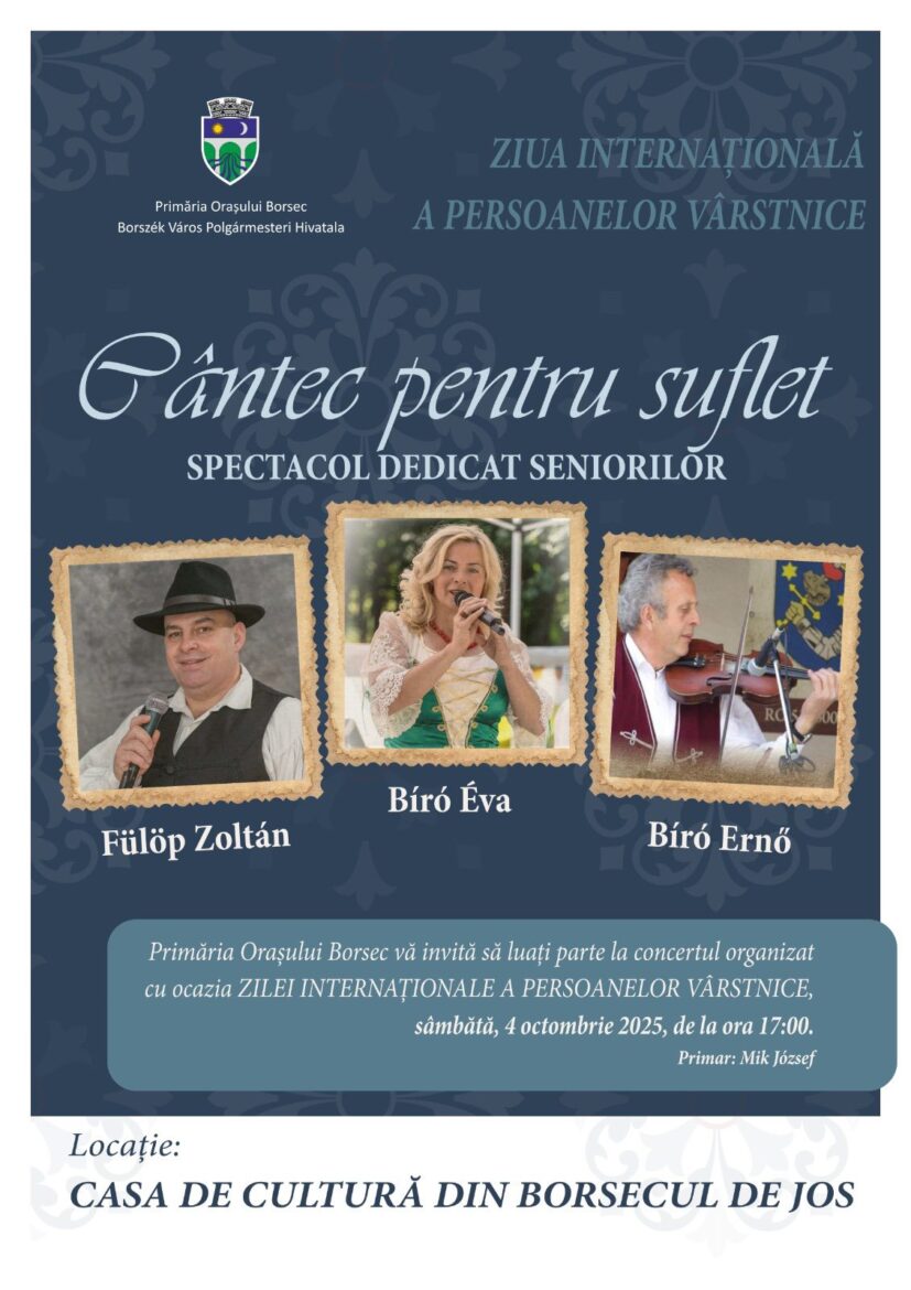 Orașul Borsec, Harghita, se pregătește de o sărbătoare plină de emoție și respect, dedicată celor care au pus temelia comunității. Cu ocazia Zilei Internaționale a Persoanelor Vârstnice, Primăria Orașului Borsec organizează sâmbătă, 4 octombrie 2025, începând cu ora 17:00, la Casa de Cultură din Borsec de Jos, spectacolul intitulat sugestiv „Cântec pentru suflet”. Evenimentul este un dar din partea administrației locale pentru seniorii orașului, un gest prin care Primăria Borsec […]
