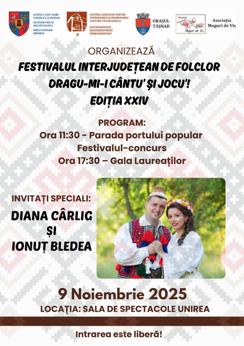 Primăria orașului Tășnad, Satu Mare, vă invită să sărbătoriți tradițiile autentice la Festivalul Interjudețean de Folclor „Dragu-mi-i Cântu’ și Jocu’!”, ediția a XXIV-a, duminică, 9 noiembrie!