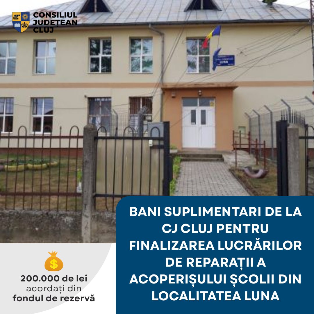 Consiliul Județean Cluj a aprobat, în cadrul ședinței ordinare din 27 noiembrie a.c., alocarea sumei de 200.000 de lei pentru finalizarea lucrărilor de reparații la acoperișul Școlii Gimnaziale din localitatea Luna. Această nouă finanțare se adaugă celor 200.000 de lei alocați în luna octombrie, suma totală destinată intervențiilor urgente ridicându-se astfel la 400.000 de lei, provenind integral din fondul de rezervă al Consiliului Județean. De ce sunt necesare lucrările. Potrivit […]