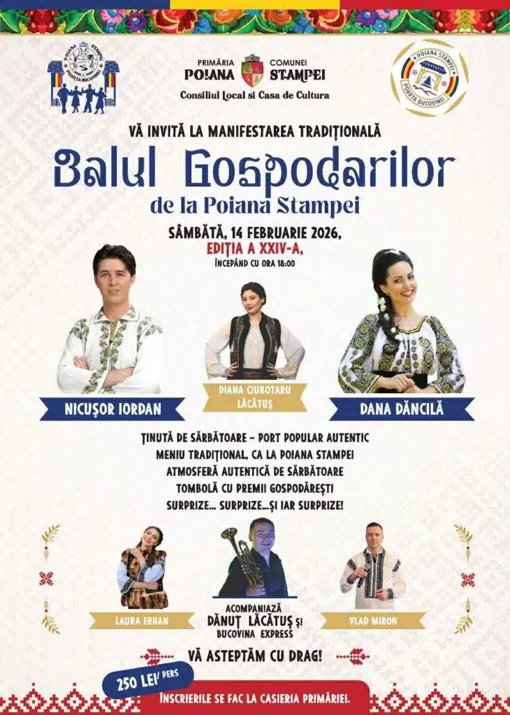 Comuna Poiana Stampei, județul Suceava, se pregătește pentru unul dintre cele mai reprezentative evenimente ale iernii bucovinene: Balul Gospodarilor, ajuns în 2026 la ediția a XXIV-a. Manifestarea, organizată de Primăria și Consiliul Local, împreună cu Casa de Cultură, va avea loc sâmbătă, 14 februarie 2026, începând cu ora 18:00, și promite o seară autentică, dedicată valorilor satului românesc. O tradiție care dăinuie de peste două decenii. De mai bine de […]