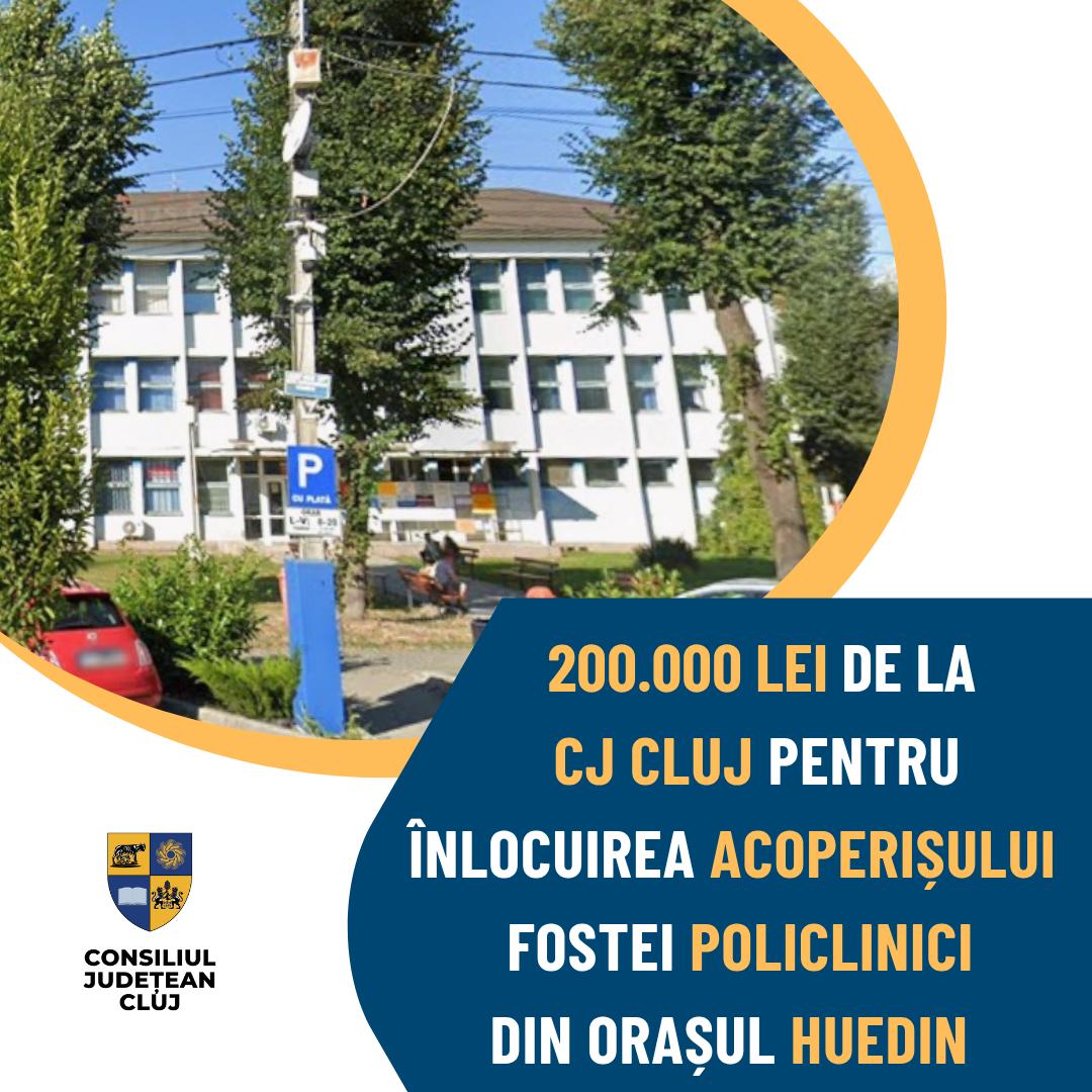 Forul administrativ județean a alocat suma de 200.000 de lei pentru înlocuirea acoperișului fostei Policlinici din orașul Huedin, clădire publică amplasată în zona centrală, în Piața Victoriei nr. 7.