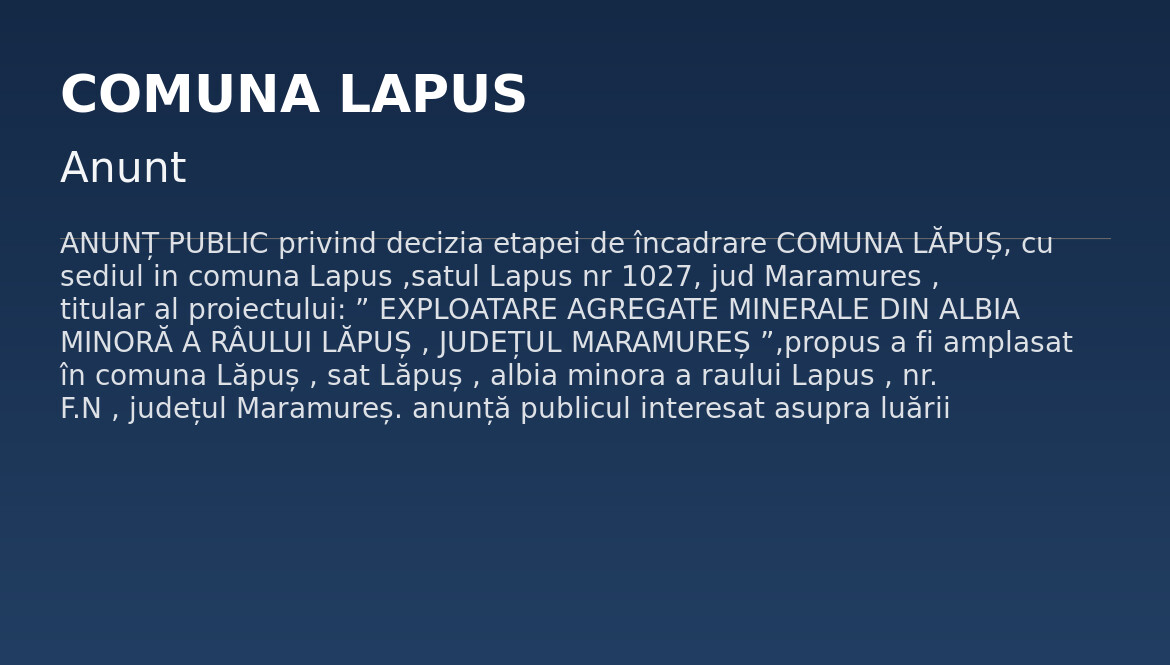 COMUNA LĂPUȘ, cu sediul in comuna Lapus ,satul Lapus nr 1027, jud Maramures , titular al proiectului: ” EXPLOATARE AGREGATE MINERALE DIN ALBIA MINORĂ A RÂULUI LĂPUȘ , JUDEȚUL MARAMUREȘ ”,propus a fi amplasat în comuna Lăpuș , sat Lăpuș , albia minora a raului Lapus , nr. F.N , județul Maramureș. anunță publicul interesat asupra luării deciziei etapei de încadrare de către Agentia Nationala de Mediu si Arii Protejate -DJM Maramures, în cadrul procedurii de evaluare a impactului asupra mediului, pentru proiectul mai sus menționat.