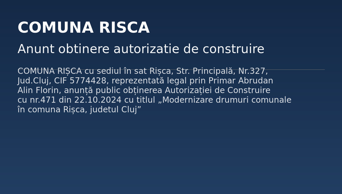 COMUNA RIȘCA cu sediul în sat Rișca, Str. Principală, Nr.327, Jud.Cluj, CIF 5774428, reprezentată legal prin Primar Abrudan Alin Florin, anunță public obținerea Autorizației de Construire cu nr.471 din 22.10.2024 cu titlul „Modernizare drumuri comunale în comuna Rișca, judetul Cluj”