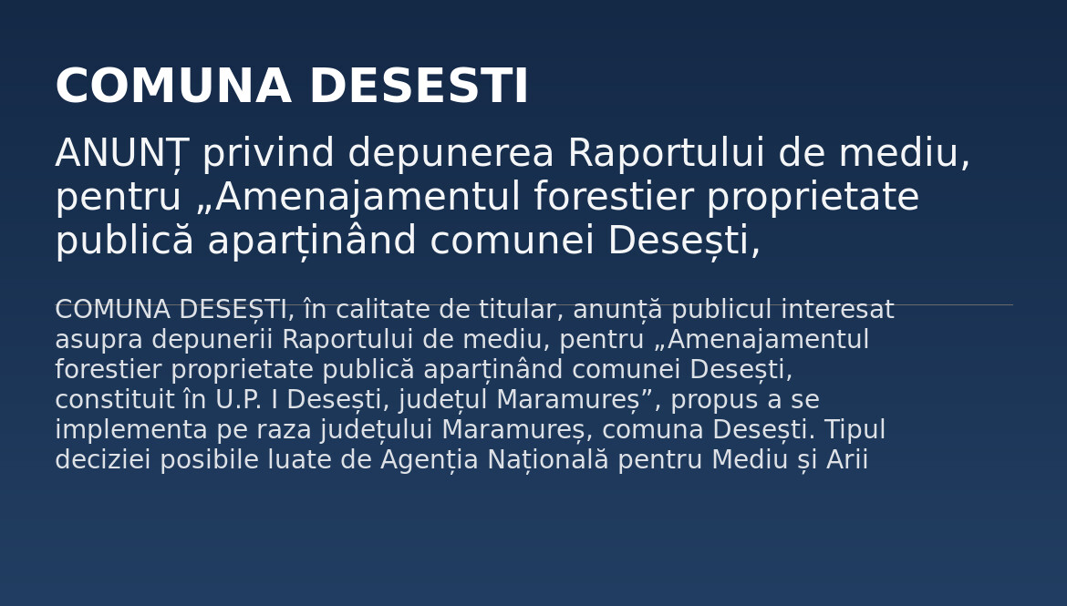 COMUNA DESEȘTI, în calitate de titular, anunță publicul interesat asupra depunerii Raportului de mediu, pentru „Amenajamentul forestier proprietate publică aparținând comunei Desești, constituit în U.P. I Desești, județul Maramureș”, propus a se implementa pe raza județului Maramureș, comuna Desești.