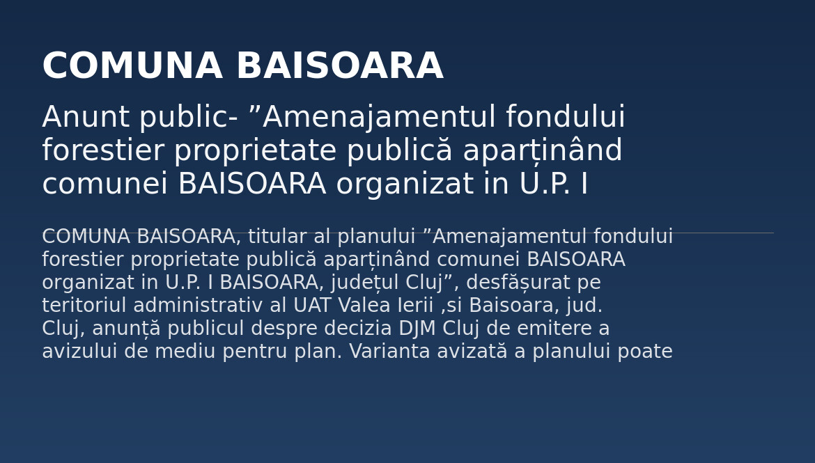 COMUNA BAISOARA, titular al planului ”Amenajamentul fondului forestier proprietate publică aparținând comunei BAISOARA organizat in U.P. I BAISOARA, județul Cluj”, desfășurat pe teritoriul administrativ al UAT Valea Ierii ,si Baisoara, jud. Cluj, anunță publicul despre decizia DJM Cluj de emitere a avizului de mediu pentru plan.