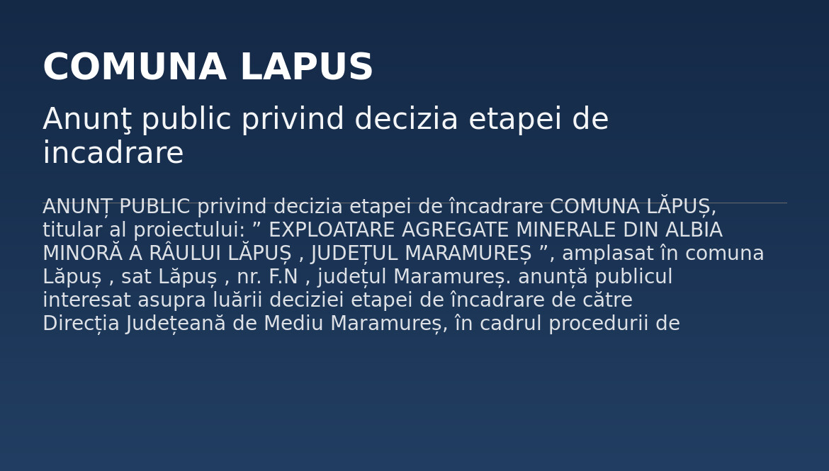 COMUNA LĂPUȘ, titular al proiectului: ” EXPLOATARE AGREGATE MINERALE DIN ALBIA MINORĂ A RÂULUI LĂPUȘ , JUDEȚUL MARAMUREȘ ”, amplasat în comuna Lăpuș , sat Lăpuș , nr. F.N , județul Maramureș.