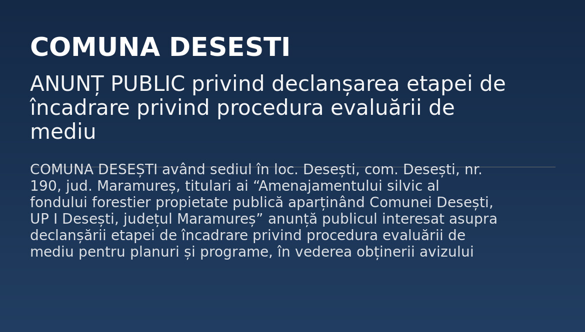 COMUNA DESEȘTI având sediul în loc. Desești, com. Desești, nr. 190, jud. Maramureș, titulari ai “Amenajamentului silvic al fondului forestier propietate publică aparținând Comunei Desești, UP I Desești, județul Maramureș” anunță publicul interesat asupra declanșării etapei de încadrare privind procedura evaluării de mediu pentru planuri și programe, în vederea obținerii avizului de mediu. Prima versiune a planului poate fi consultată la sediul Agenției Naționale pentru Mediu și Arii Protejate – ST Maramureș din localitatea Baia Mare, str. Iza, nr.1A, de luni până joi între orele 8:00 – 16:30 și vineri între orele 8:00 – 14:00.