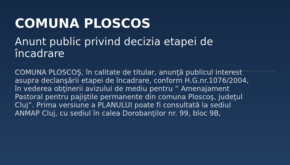 COMUNA PLOSCOŞ, în calitate de titular, anunţă publicul interest asupra declanşării etapei de încadrare, conform H.G.nr.1076/2004, în vederea obţinerii avizului de mediu pentru   “ Amenajament Pastoral pentru pajiştile permanente din comuna Ploscoş, judeţul Cluj”.       Prima versiune a PLANULUI poate fi consultată la sediul ANMAP Cluj, cu sediul în calea Dorobanţilor nr. 99, bloc 9B, judeţul Cluj în zilele de luni-vineri, între orele 08.00-16.00, din data de 23.06.2025.Publicul interesat poate transmite, […]