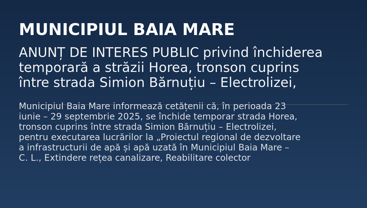 Municipiul Baia Mare informează cetățenii că, în perioada 23 iunie – 29 septembrie 2025, se închide temporar strada Horea, tronson cuprins între strada Simion Bărnuțiu – Electrolizei, pentru executarea lucrărilor la „Proiectul regional de dezvoltare a infrastructurii de apă și apă uzată în Municipiul Baia Mare – C. L., Extindere rețea canalizare, Reabilitare colector canalizare”. Măsura de închidere a circulației este determinată de natura complexă a lucrărilor, incluzând săpături […]