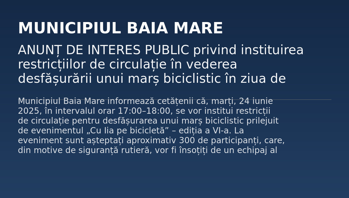 ANUNȚ DE INTERES PUBLIC privind instituirea restricțiilor de circulație în vederea desfășurării unui marș biciclistic în ziua de marți, 24 iunie 2025, între orele 17:00 – 18:00