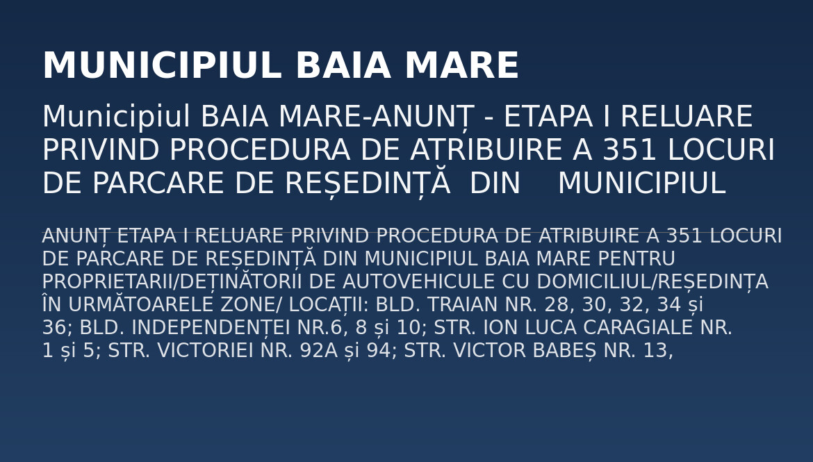 Municipiul BAIA MARE-ANUNȚ – ETAPA I RELUARE PRIVIND PROCEDURA DE ATRIBUIRE A 351 LOCURI DE PARCARE DE REȘEDINȚĂ  DIN    MUNICIPIUL BAIA MARE