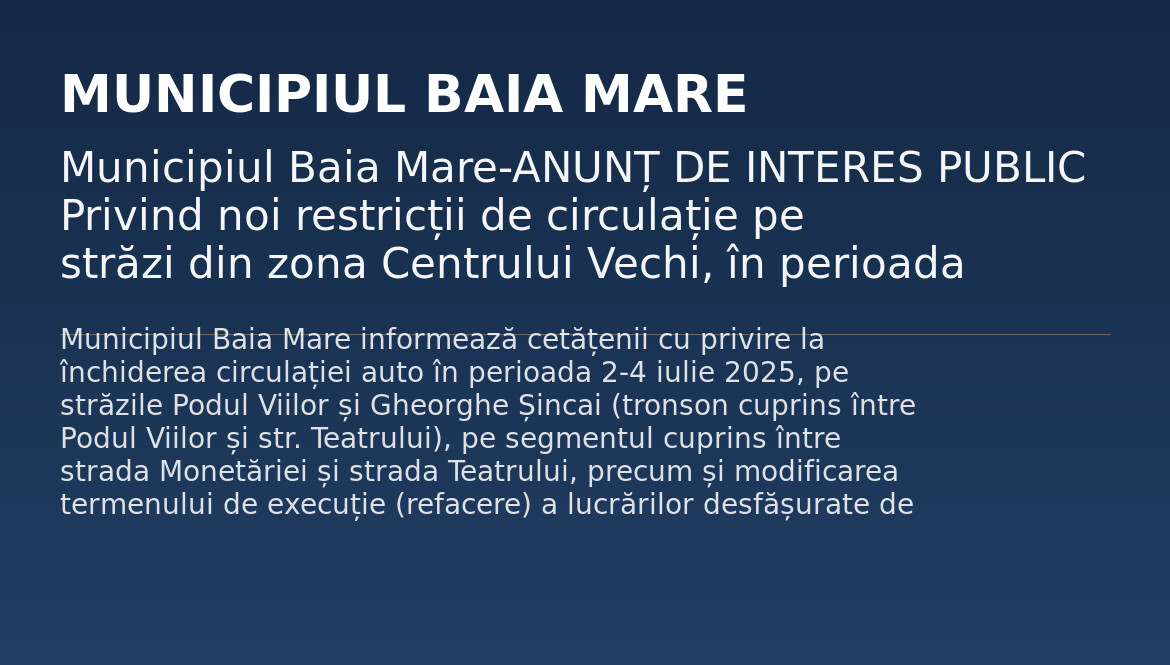 Municipiul Baia Mare-ANUNȚ DE INTERES PUBLIC Privind noi restricții de circulație pe străzi din zona Centrului Vechi, în perioada 2-4 iulie 2025, pentru execuția de lucrări la proiectul „Înlocuire conducte și branșamente gaze naturale presiune redusă și medie”