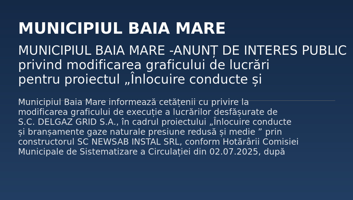 Municipiul Baia Mare informează cetățenii cu privire la modificarea graficului de execuție a lucrărilor desfășurate de S.C. DELGAZ GRID S.A., în cadrul proiectului „Înlocuire conducte și branșamente gaze naturale presiune redusă și medie ” prin constructorul SC NEWSAB INSTAL SRL, conform Hotărârii Comisiei Municipale de Sistematizare a Circulației din 02.07.2025, după cum urmează: - Vasile Lucaciu ( Piața Libertății), noua perioadă pentru lucrările de  săpătură și refacere este 7 iulie […]