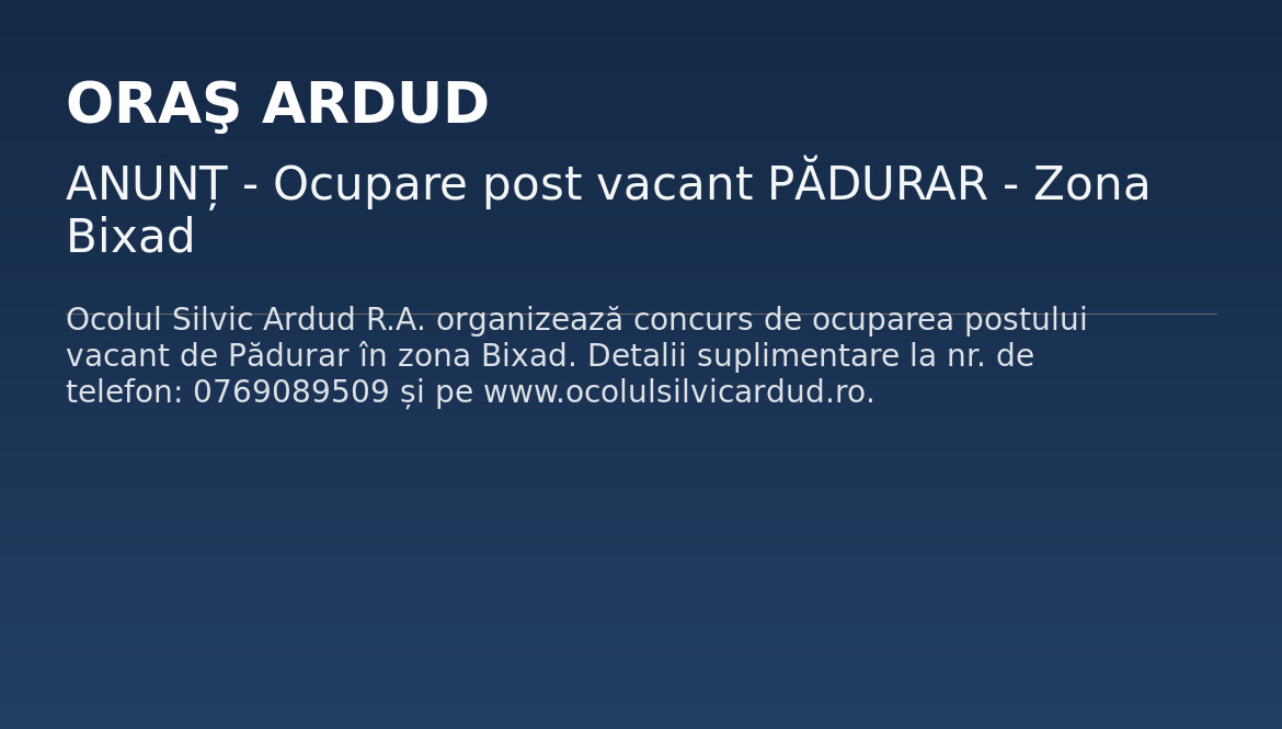 Ocolul Silvic Ardud R.A. organizează concurs de ocuparea postului de Pădurar în zona Bixad. Detalii suplimentare la nr. de telefon: 0769089509 și pe www.ocolulsilvicardud.ro.