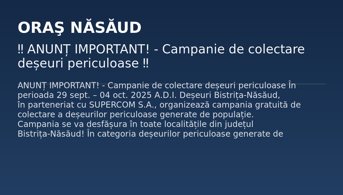 ANUNȚ IMPORTANT! - Campanie de colectare deșeuri periculoase În perioada 29 sept. – 04 oct. 2025 A.D.I. Deșeuri Bistrița-Năsăud, în parteneriat cu SUPERCOM S.A., organizează campania gratuită de colectare a deșeurilor periculoase generate de populație. Campania se va desfășura în toate localitățile din județul Bistrița-Năsăud! În categoria deșeurilor periculoase generate de populație intră: recipientele de vopsele, agenți de curățare, solvenți, lacuri, insecticide, emulsii și uleiuri, vaselină, seringi folosite, medicamente expirate, […]