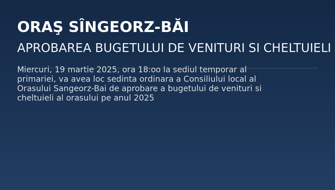 Miercuri, 19 martie 2025, ora 18:oo la sediul temporar al primariei, va avea loc sedinta ordinara a Consiliului local al Orasului Sangeorz-Bai de aprobare a bugetului de venituri si cheltuieli al orasului pe anul 2025