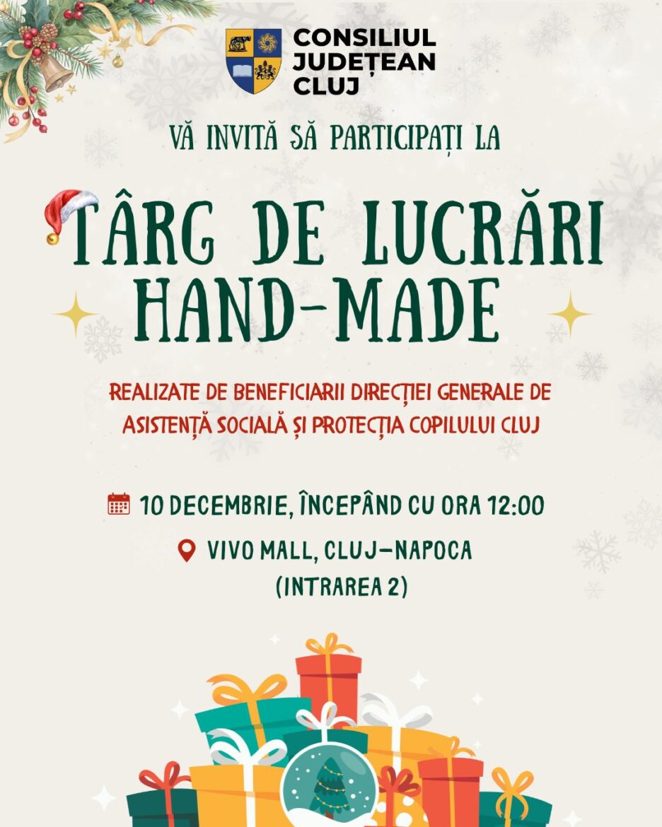 Atmosfera sărbătorilor de iarnă capătă o notă specială în acest an la Cluj, odată cu organizarea unui eveniment dedicat solidarității și creativității persoanelor vulnerabile. Consiliul Județean Cluj invită publicul larg să participe la Târgul de lucrări hand-made realizate de beneficiarii Direcției Generale de Asistență Socială și Protecția Copilului (DGASPC) Cluj, eveniment ce va avea loc miercuri, 10 decembrie, începând cu ora 12:00, la VIVO Mall Cluj-Napoca, intrarea 2. Creativitate, emoție […]