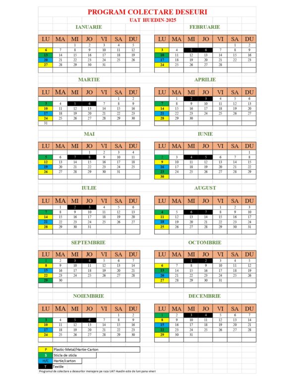 Primăria Orașului Huedin, Cluj, informează cetățenii cu privire la programul de colectare a deșeurilor, în vederea asigurării unui oraș mai curat și a unui mediu sănătos. Program de colectare – Luni: P – Plastic, metal, hârtie, carton S – Sticlă H/C – Hârtie și carton Primele zile de miercuri și joi ale fiecărei luni: T – Deșeuri textile Puncte de colectare gratuite pentru deșeuri voluminoase și DEEE (echipamente electrice și electronice): SC TRANSIM SA (fosta Autogară), str. Vlădeasa nr. 43 […]