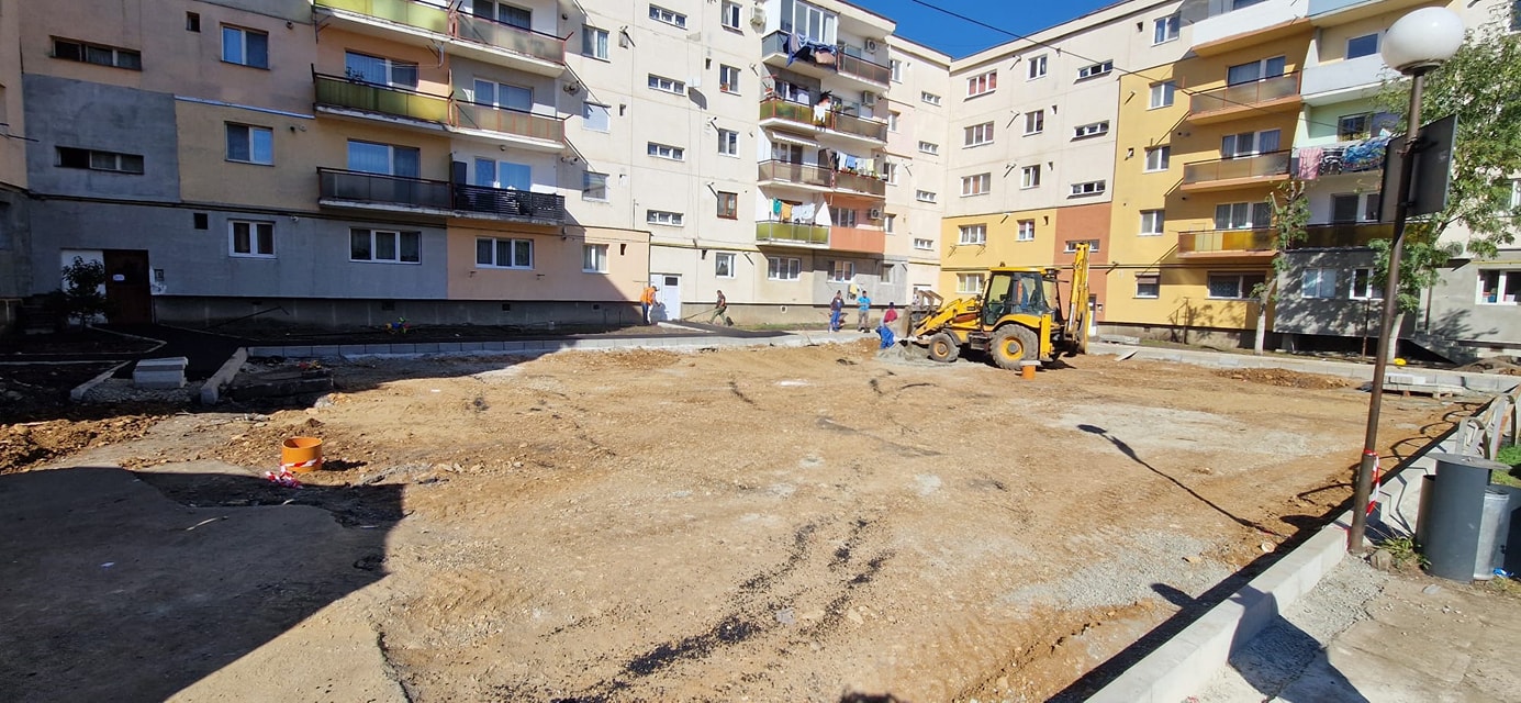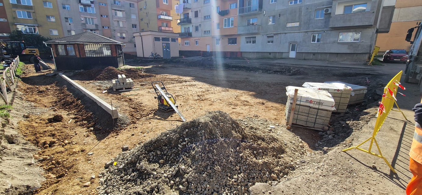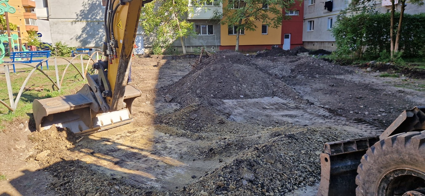 După demolarea garajelor vechi, au început lucrările de pregătire a terenului: decopertarea pământului vegetal și consolidarea fundației cu balast. Totodată, am realizat toaletarea spațiilor verzi din zonă, pentru a optimiza spațiul destinat parcărilor.