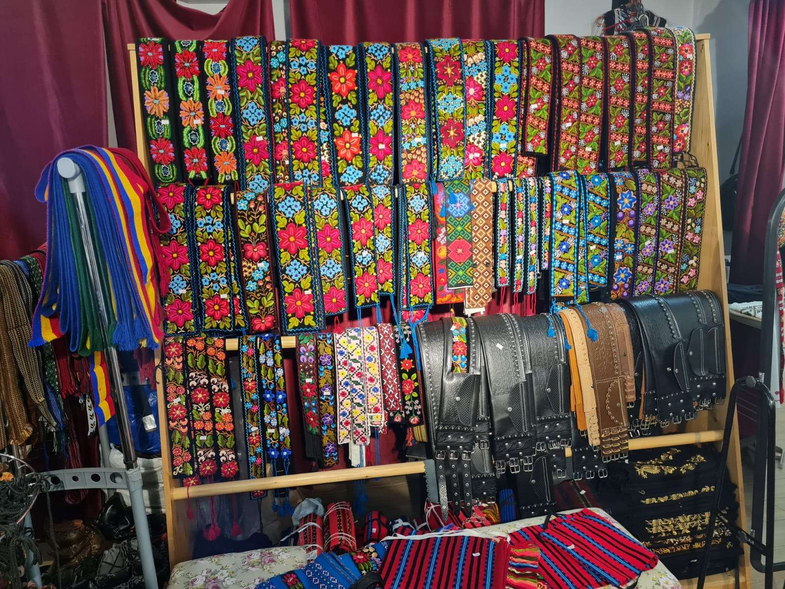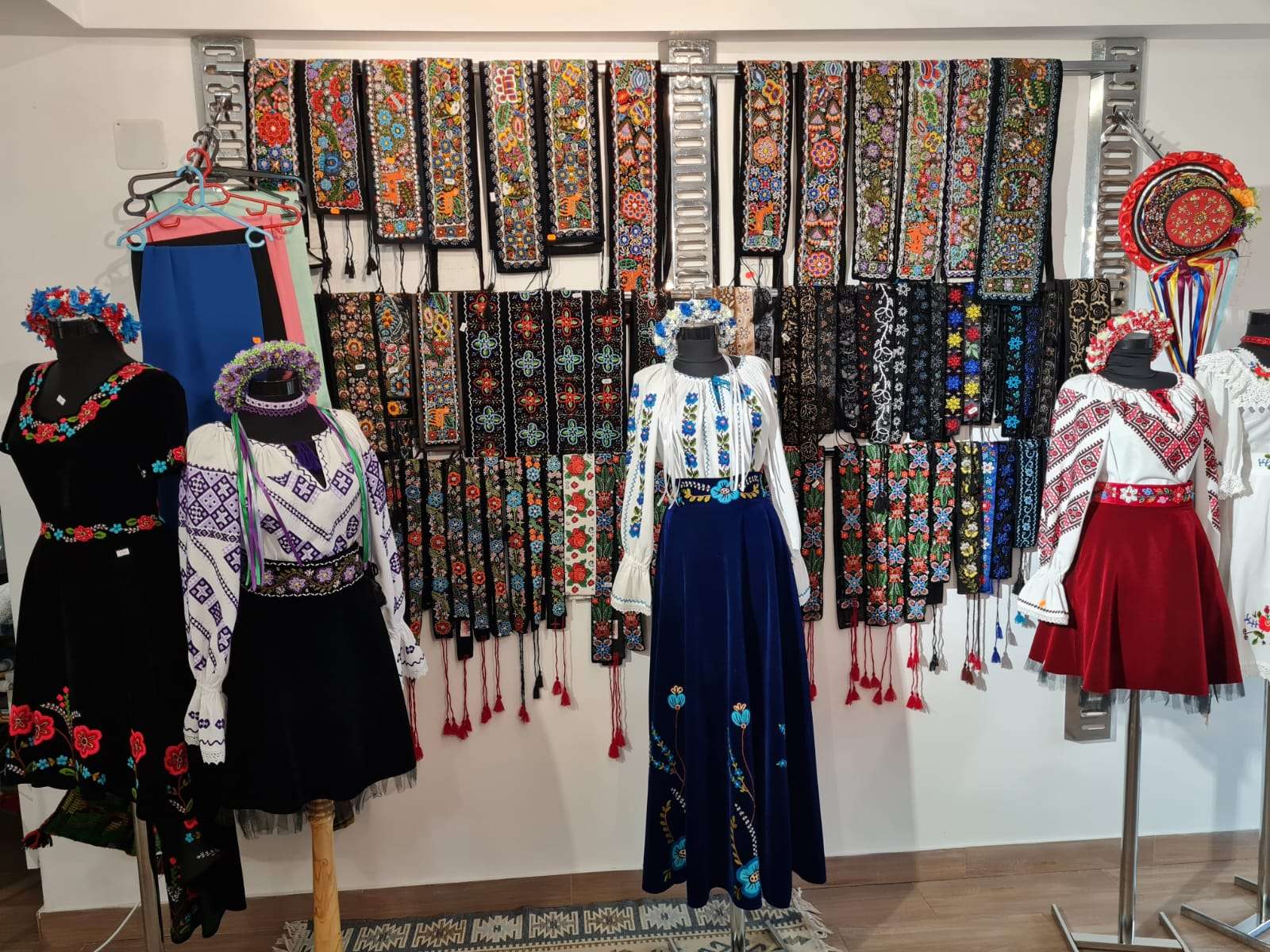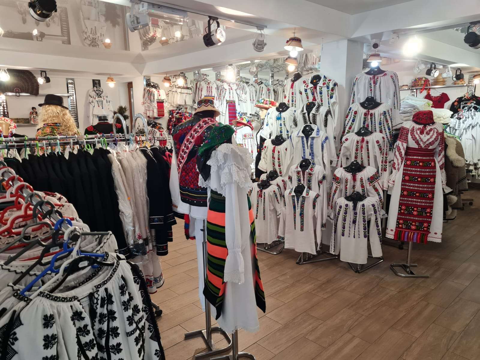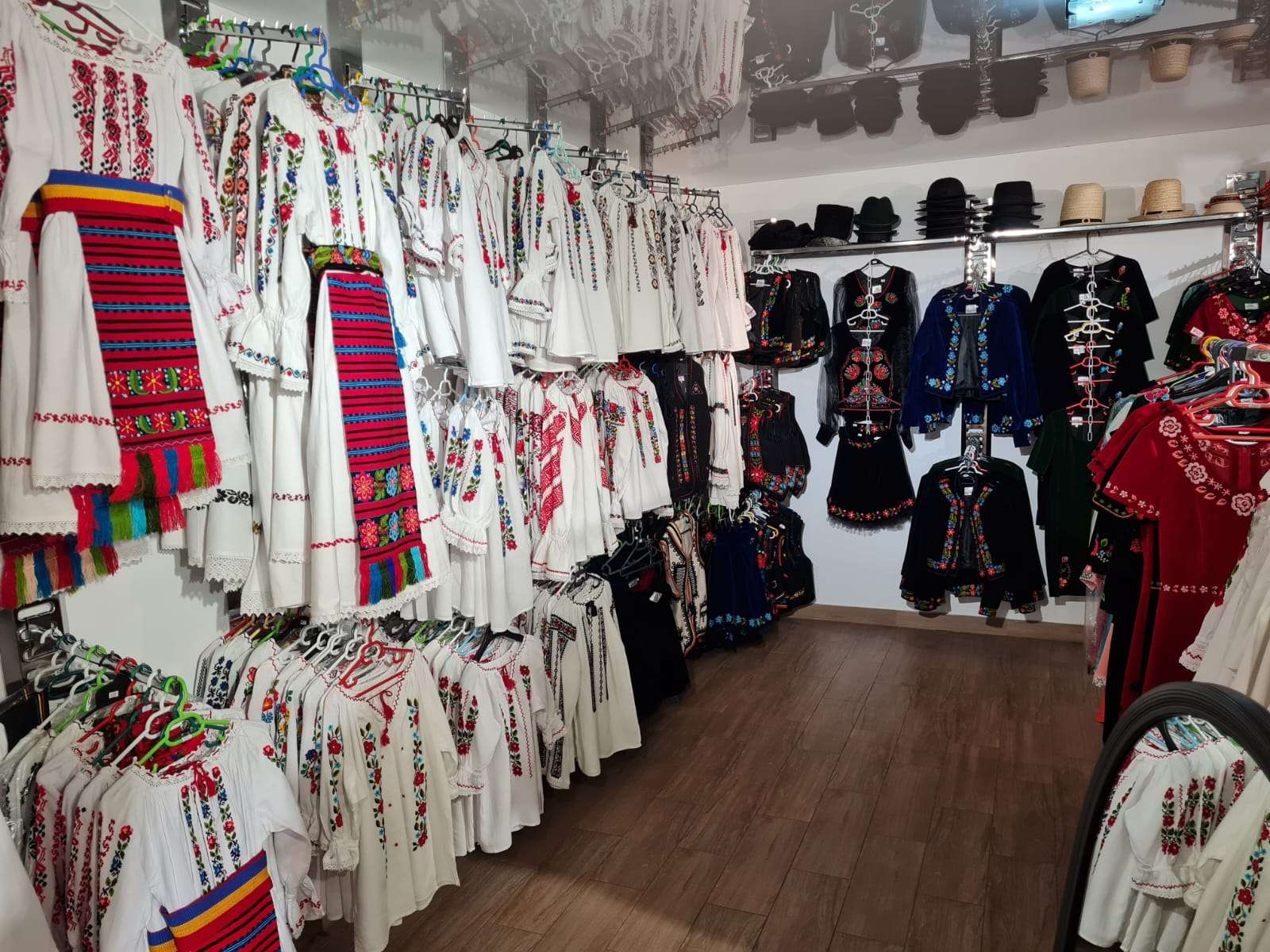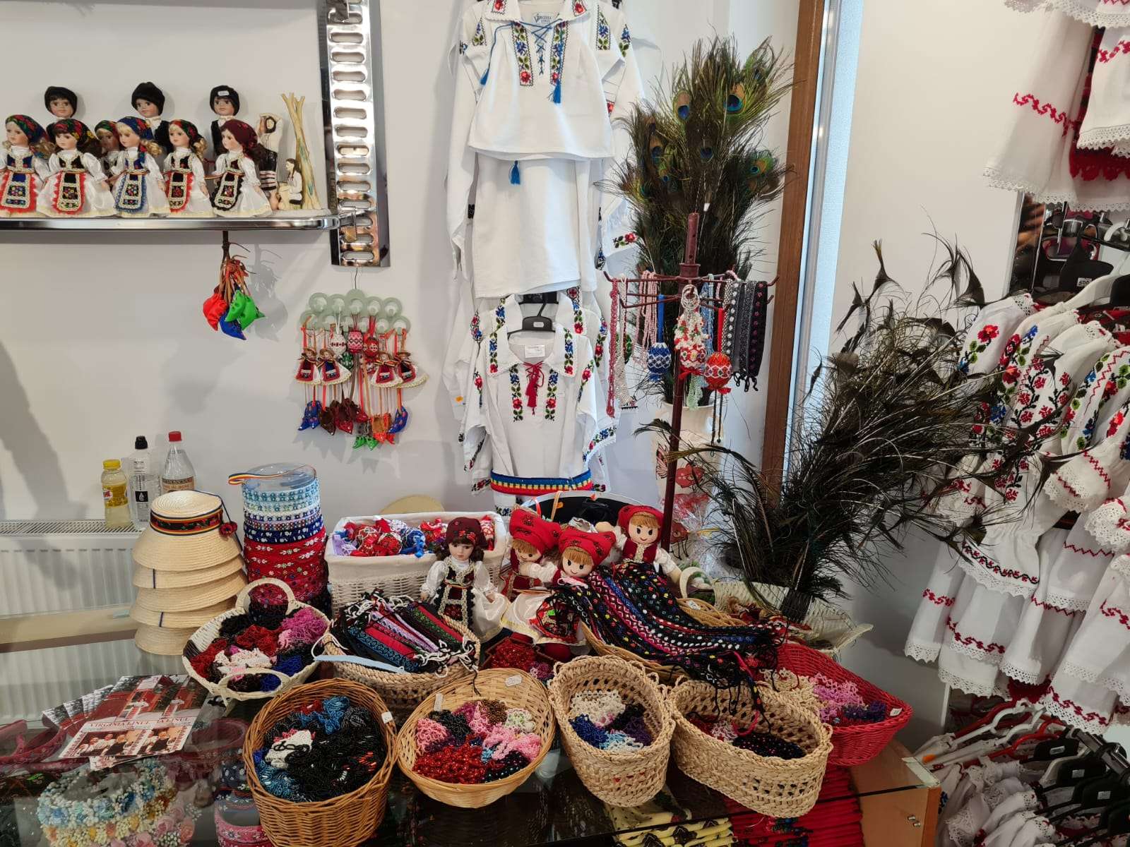 După ce am terminat cu degustatul și le-am ținut din treabă suficient pe doamne ne-am retras cu Virginia Linul în Casa Costumului Popular. Nici nu știu cum să vă descriu în cuvinte ce întâlnești în acel loc. Costume din toate zonele țării și toate mărimile posibile, opinci, cizme, curele, pălării, mărgele, coliere, veste, paltoane, rochii din Linia Tradițională si alte obiecte vestimentare la care nu mă pricep. Cert este că locul e atât de frumos gândit încât nu simți că ești într-un magazin, mai degrabă te simți ca într-un muzeu, dar nu unul rece ci unul cald, așa cum era camera aceea a bunicilor în care iși păstrau cele mai de preț obiecte.