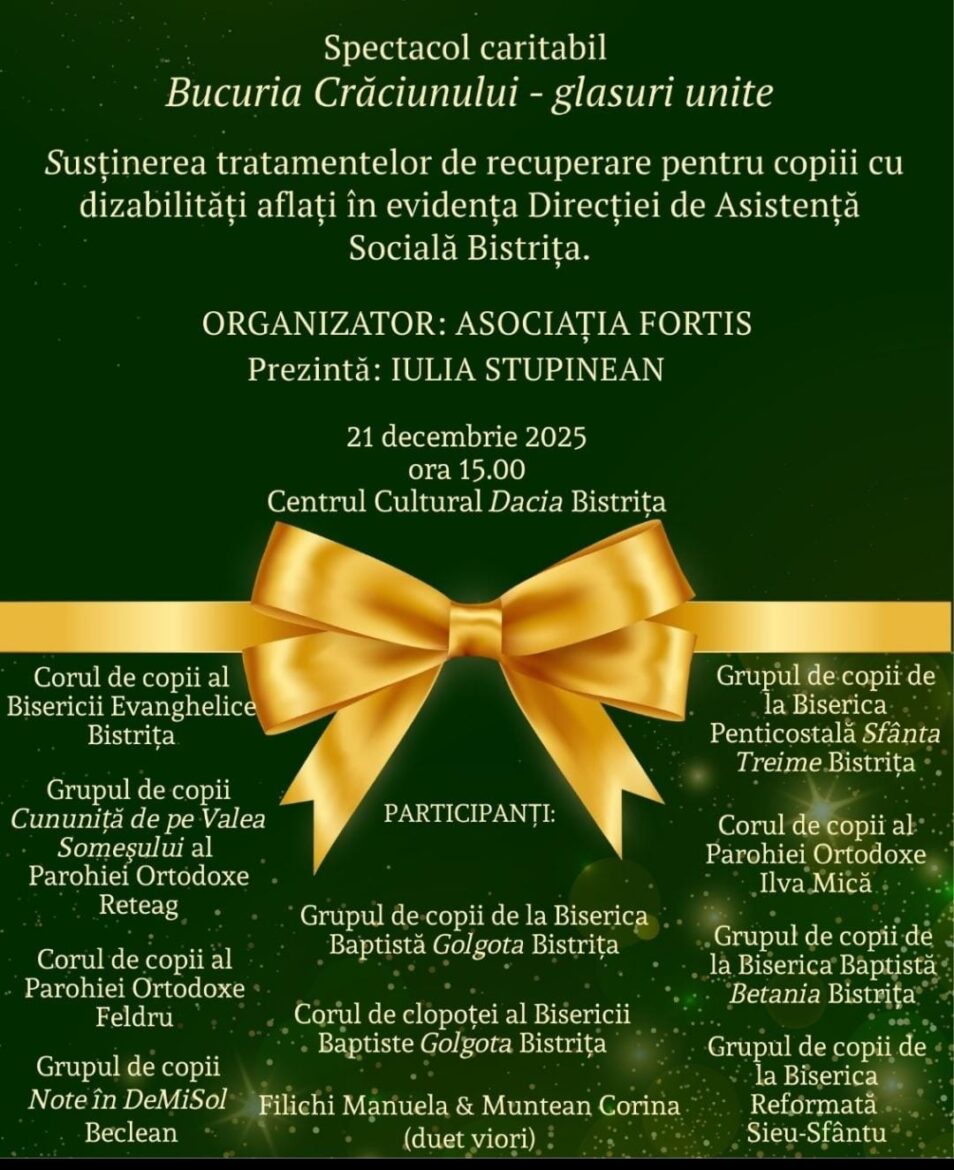 Spectacolul caritabil „Bucuria Crăciunului – glasuri unite”, organizat de Asociația Fortis, în parteneriat cu Direcția de Asistență Socială Bistrița, va avea loc duminică, 21 decembrie 2025, începând cu ora 15.00, la Centrul Cultural Dacia din Bistrița.