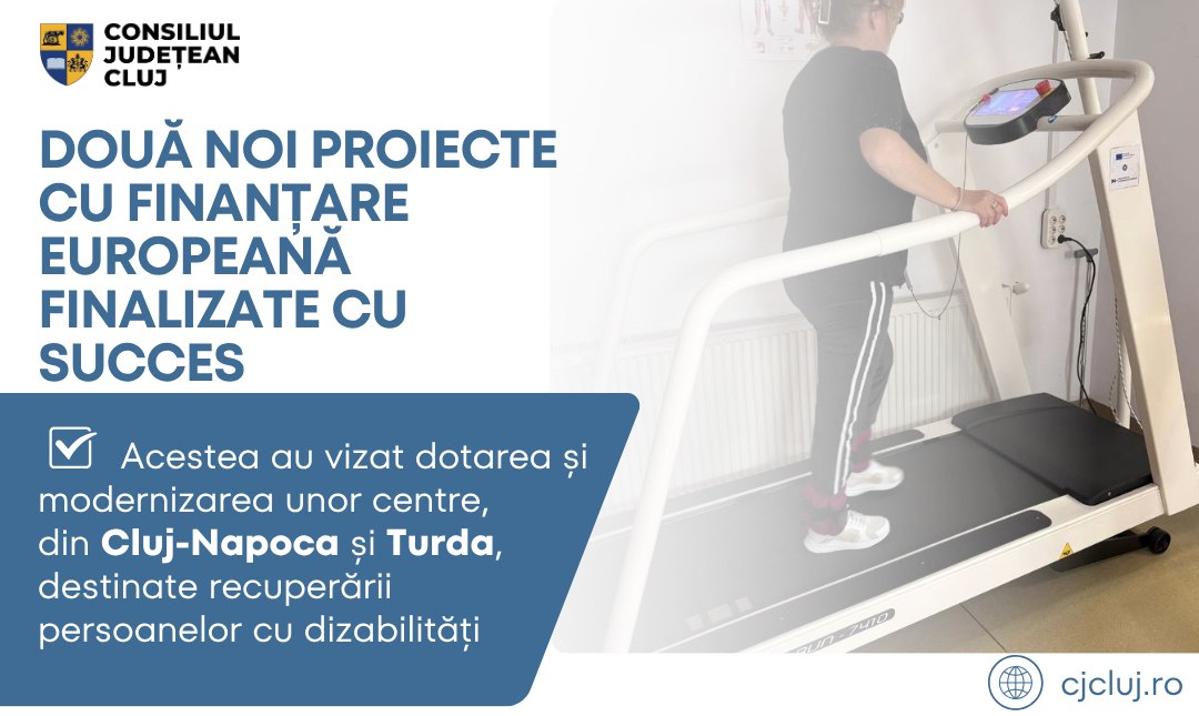 Direcția Generală de Asistență Socială și Protecția Copilului Cluj (D.G.A.S.P.C. Cluj), instituție aflată în subordinea Consiliului Județean Cluj, a finalizat cu succes două proiecte finanțate prin Planul Național de Redresare și Reziliență (PNRR), care au vizat dotarea și modernizarea centrelor de recuperare neuromotorie destinate persoanelor adulte cu dizabilități din Cluj-Napoca și Turda.