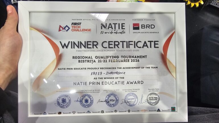 În cadrul acestei competiții, echipa InfotronX a fost distinsă cu premiul „Nație prin Educație Award”, o recunoaștere specială care evidențiază progresul continuu, implicarea constantă și contribuția echipei la promovarea educației STEM. Premiul este acordat echipelor care nu doar construiesc roboți performanți, ci și demonstrează că învățarea, perseverența și inovația sunt valori fundamentale în dezvoltarea tinerilor și, implicit, a comunității.