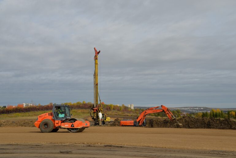 În paralel, se efectuează lucrări de organizare de șantier, decopertare a stratului vegetal și lărgirea accesului pentru utilaje de mare tonaj, operațiuni necesare pentru buna desfășurare a etapelor viitoare ale construcției.