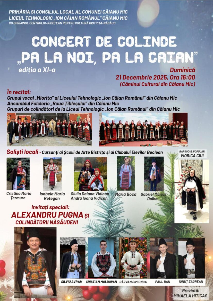 „Vă așteptăm cu drag! Cu ocazia sărbătorii Nașterii Domnului nostru Iisus Hristos, Primăria Căianu Mic, în colaborare cu Liceul Tehnologic „Ion Căian Românul” și Centrul Județean pentru Cultură Bistrița-Năsăud, vă invită la un concert deosebit de colinde.