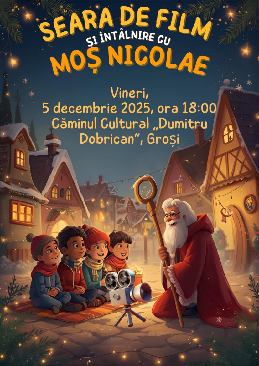 „Dragi copilași, vă invităm cu multă bucurie să petrecem împreună o seară de poveste la Căminul Cultural „Dumitru Dobrican” din Groși, unde vom păși într-o lume magică odată cu vizionarea unui film special pregătit pentru voi!
