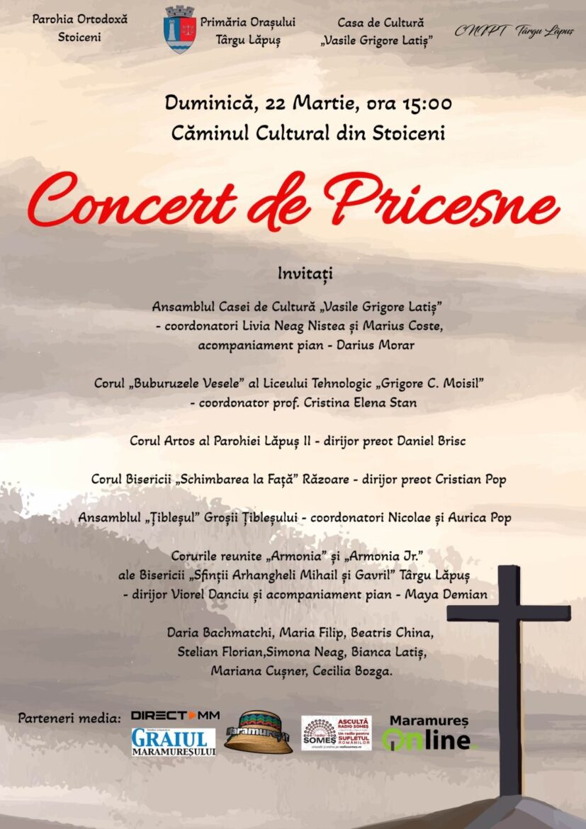 Duminică, 22 martie 2026, la Căminul Cultural din Stoiceni, localitate aparținătoare orașului Târgu Lăpuș, județul Maramureș, are loc un eveniment de o frumusețe aparte, dedicat muzicii religioase tradiționale: Concertul de Pricesne.