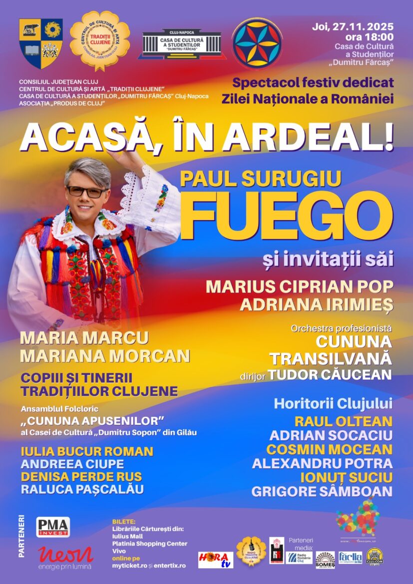 27 noiembrie. Bilete disponibile acum! aduce spectacolul „Acasă în Ardeal!” Joi muzică tradiție și emoție românească: Clujul sărbătorește românește. Paul Surugiu – Fuego