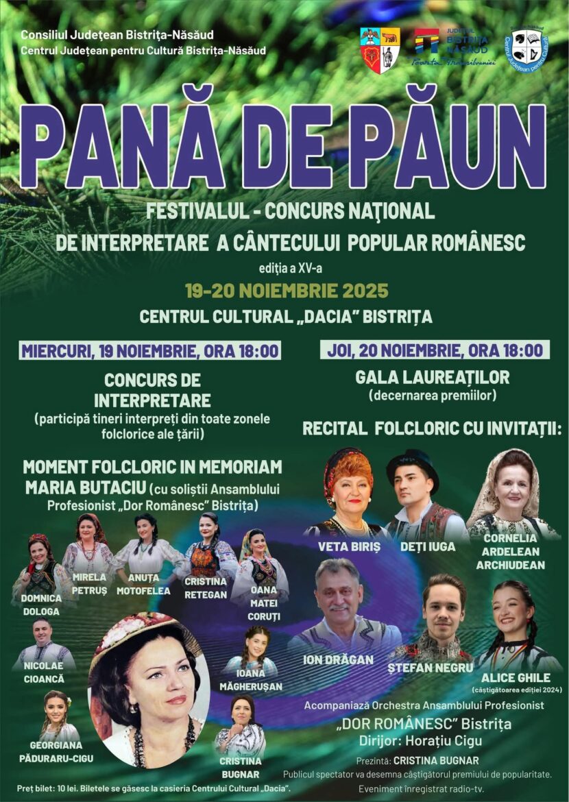 „Pană de Păun” la Bistrița: Consiliul Județean și Centrul Județean pentru Cultură Bistrița-Năsăud susțin tinerele talente și valorile folclorice naționale în perioasa 19-20 noiembrie! sărbătoarea cântecului românesc autentic