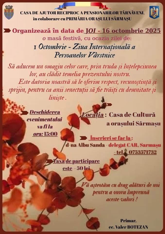 Evenimentul va avea loc în data de joi, 16 octombrie 2025, începând cu ora 15:00, la Casa de Cultură a orașului Sărmașu. Este o inițiativă menită să aducă împreună vârstnicii comunității, într-un cadru festiv și cald, în care să se simtă valorizați și prețuiți.