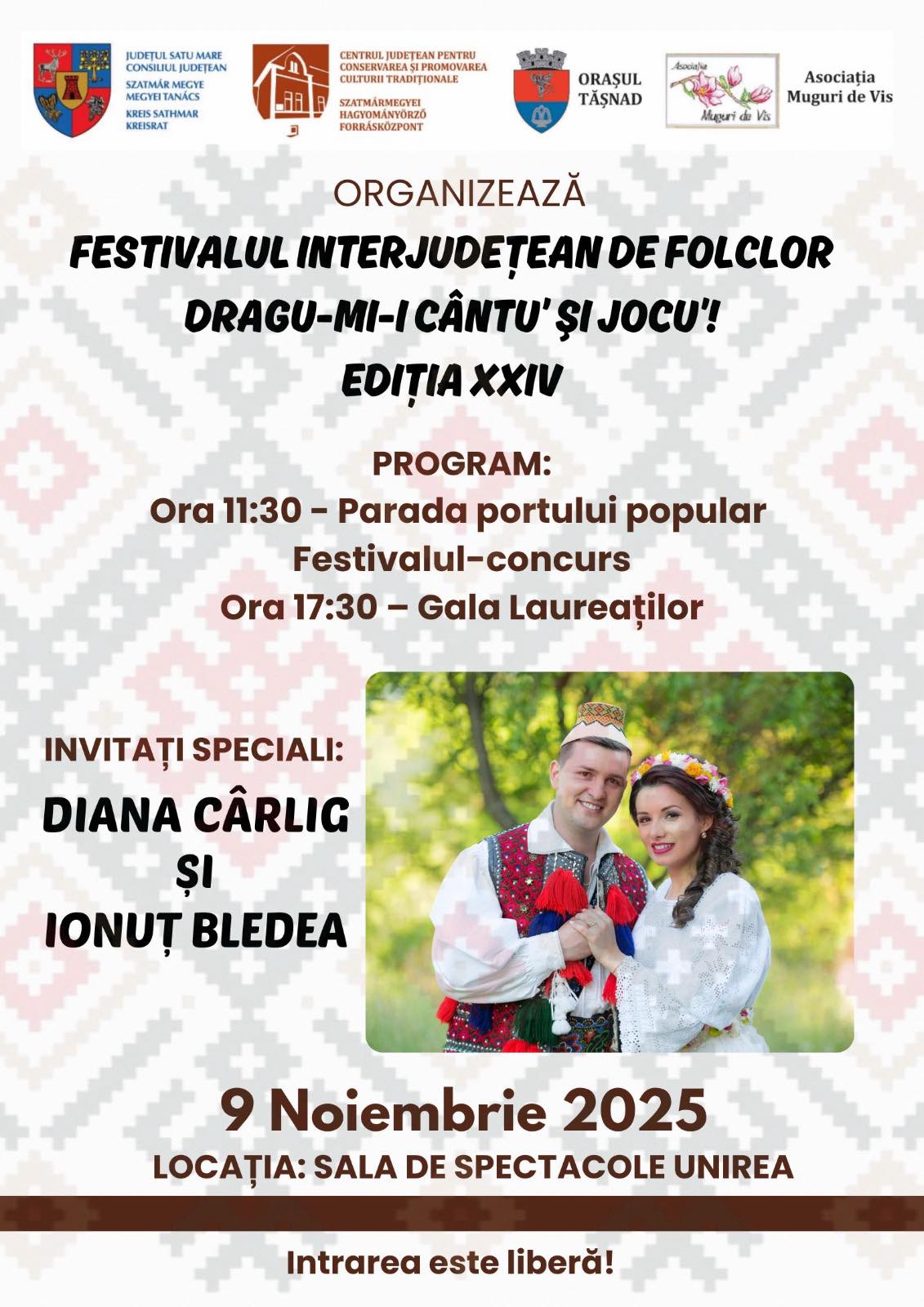 9 noiembrie! Duminică ediția a XXIV-a Primăria orașului Tășnad Satu-Mare vă invită să sărbătoriți tradițiile autentice la Festivalul Interjudețean de Folclor „Dragu-mi-i Cântu’ și Jocu’!”