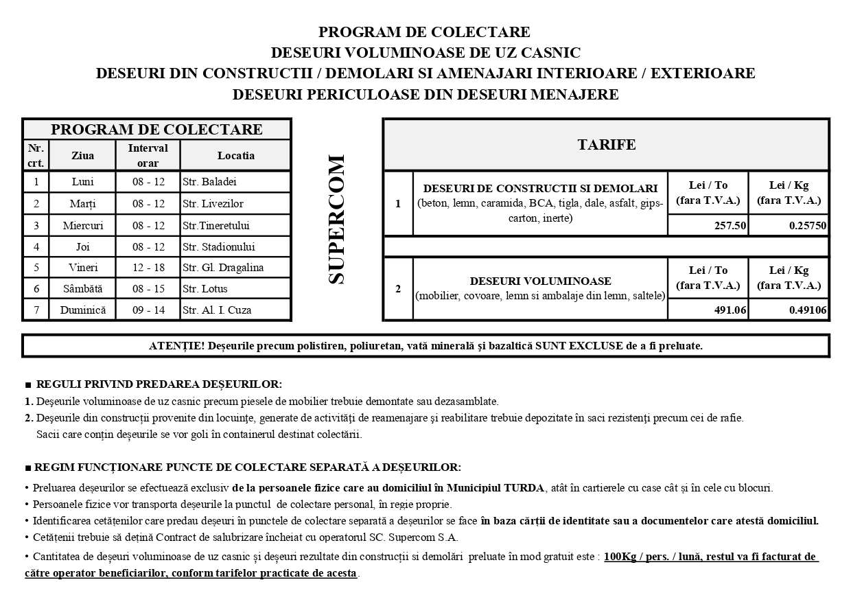 Operatorul de salubritate Supercom va prelua zilnic, conform unui program bine stabilit, deșeurile voluminoase din următoarele puncte de colectare:
