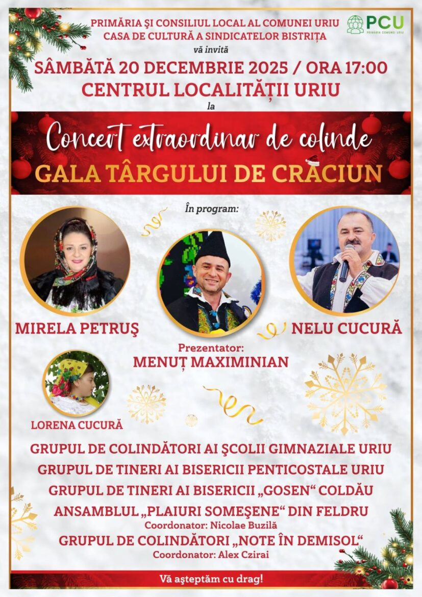 Comuna Uriu, județul Bistrița-Năsăud, devine, în prag de sărbători, un adevărat centru al tradițiilor românești, găzduind „Gala Târgului de Crăciun”, un concert extraordinar de colinde care promite emoție, bucurie și autentic spirit de Crăciun.