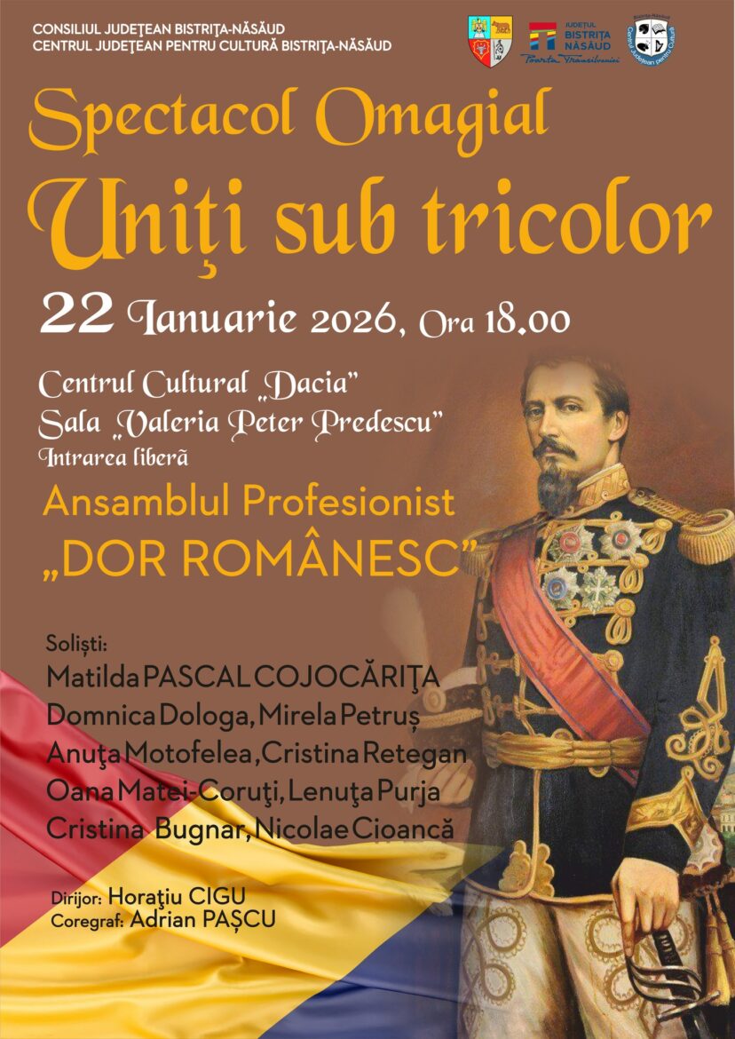22 ianuarie! dedicat Unirii Principatelor Române Joi la Centrul Cultural „Dacia” din Bistrița Spectacolul omagial „Uniți sub tricolor”