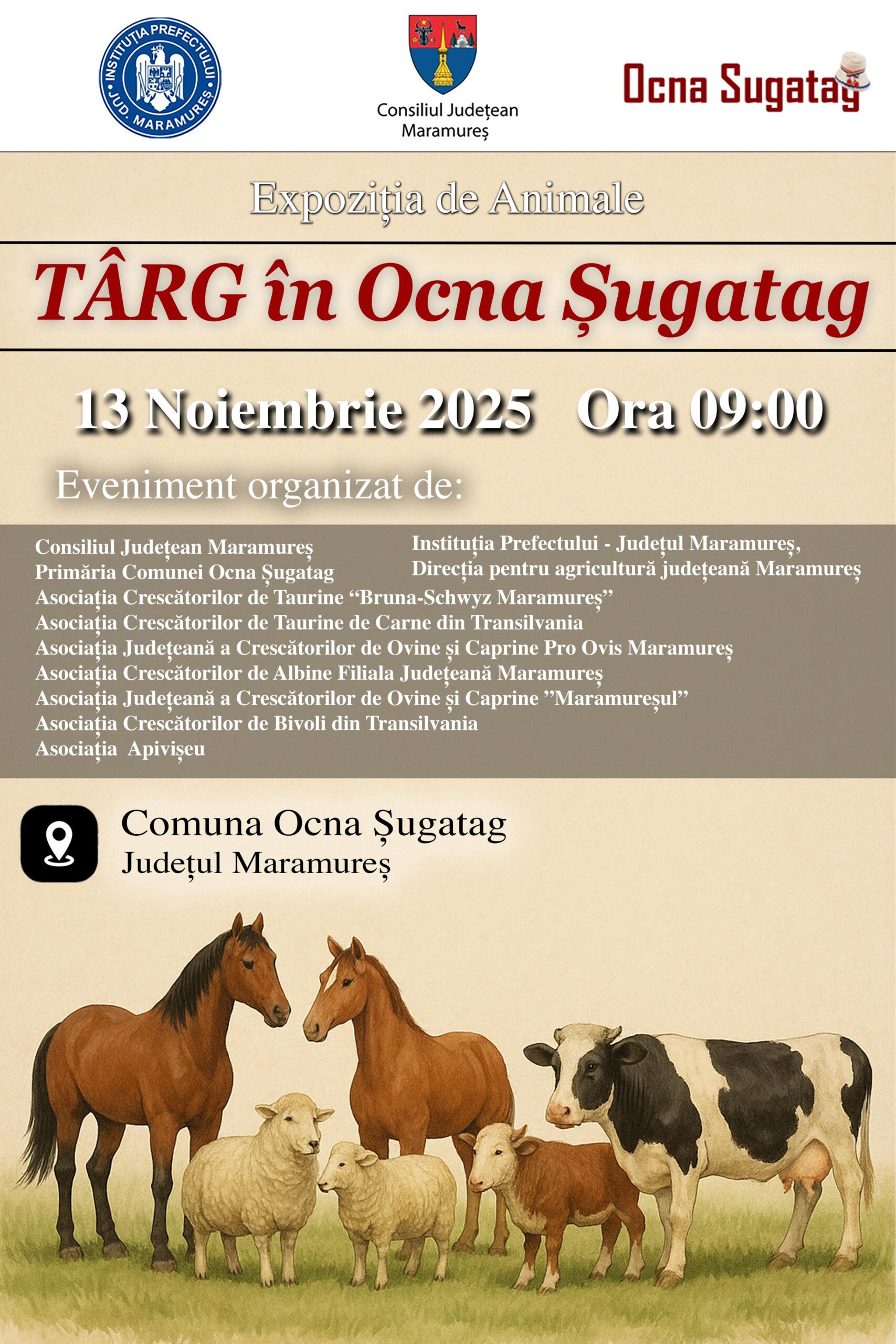 „Târgul de animale din Ocna ȘugatagDupă mulți ani de pauză, începând de joi, 13 noiembrie 2025, se redeschide Târgul de animale din localitatea Ocna Șugatag, Maramureș!Vă așteptăm cu drag pe toți crescătorii de animale și vizitatorii dornici să retrăiască atmosfera autentică a târgurilor de altădată.Haideți să redăm viață unei frumoase tradiții locale!”, au transmis reprezentanții Primăriei Ocna Șugatag.