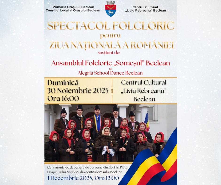 Un eveniment cultural pentru întreaga comunitate. Spectacolul va avea loc duminică, 30 noiembrie 2025, la ora 16:00, la Centrul Cultural „Liviu Rebreanu” Beclean. Evenimentul va fi susținut de Ansamblul Folcloric „Someșul” Beclean, una dintre formațiile reprezentative ale orașului, și de Alegria School Dance Beclean, care vor aduce pe scenă energia tinerilor și farmecul tradițiilor locale.