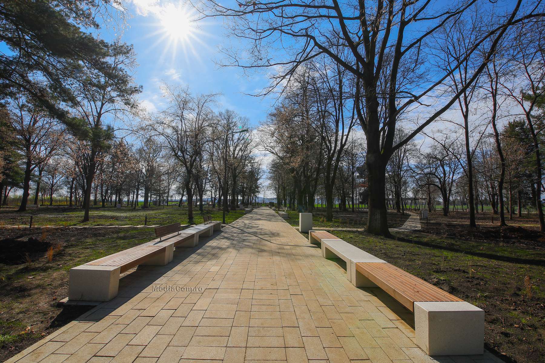 Până în acest moment, au fost amenajate aleile din parc, s-au instalat stâlpii de iluminat și s-au plantat copaci în întreaga zonă.