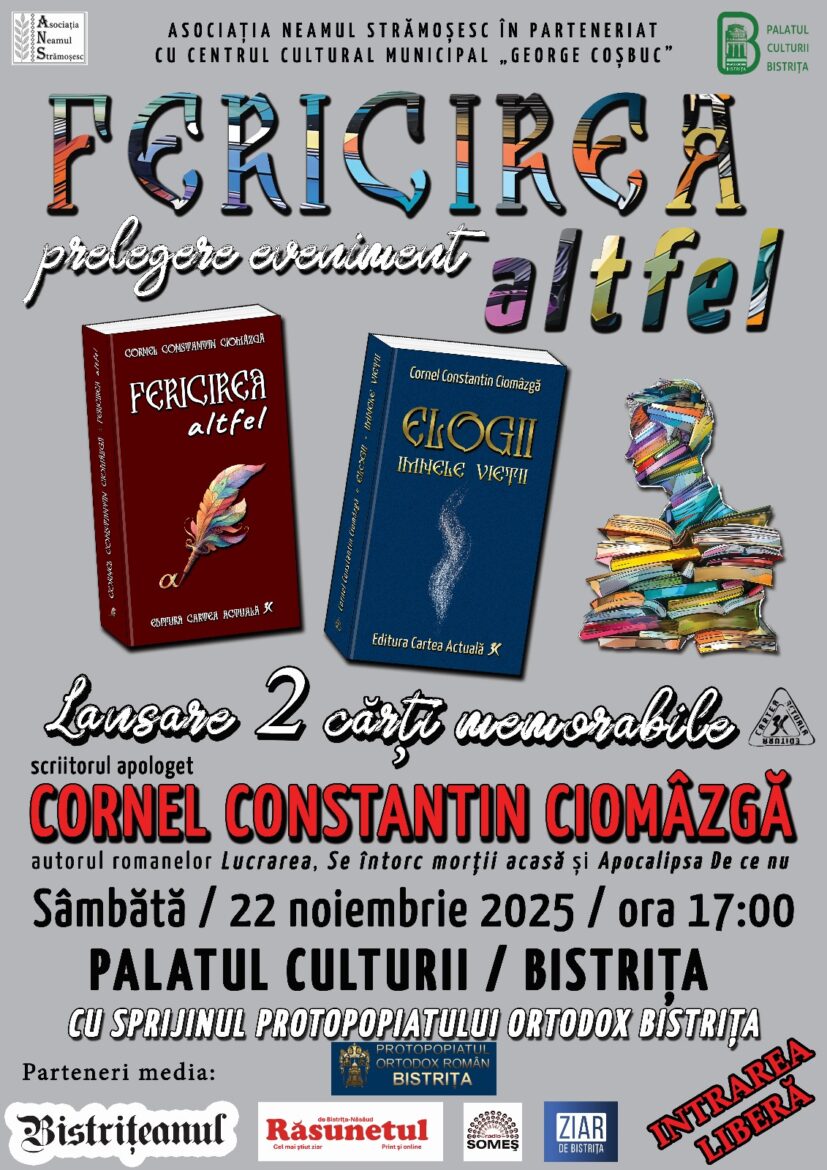 22 noiembrie! prelegerea care schimbă perspectiva asupra fericirii la Palatul Culturii sâmbătă Un eveniment cultural de excepție: Bistrița găzduiește o întâlnire unică cu Cornel Constantin Ciomâzgă. „FERICIREA ALTFEL”